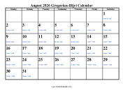 Free printable calendar with Hijri (Islamic) equivalents for August 2026. View online or print in PDF format.
