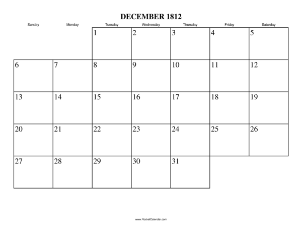 Next month: January 1813 | Previous month: November 1812 | All 1812 Calendars | Calendars for other years