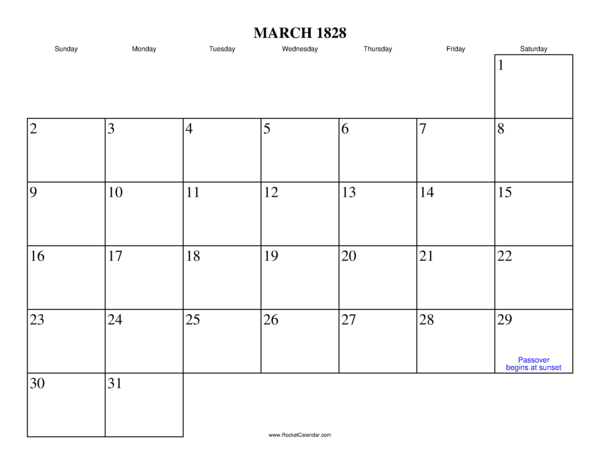 Next month: April 1828 | Previous month: February 1828 | All 1828 Calendars | Calendars for other years
