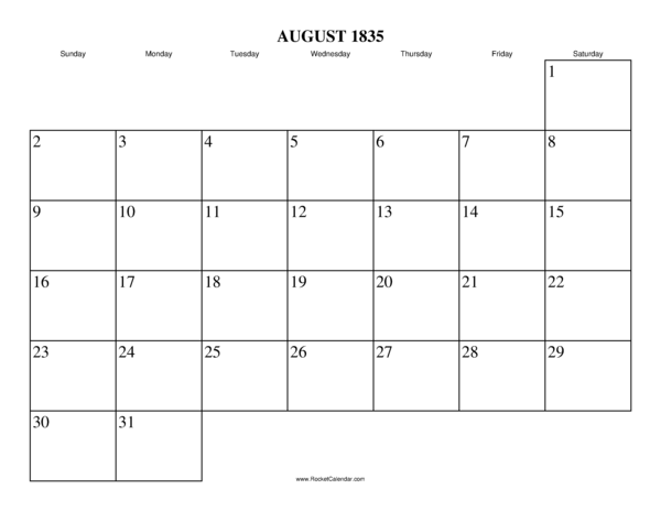 Free printable calendar for August 1835. View online or print in PDF format.