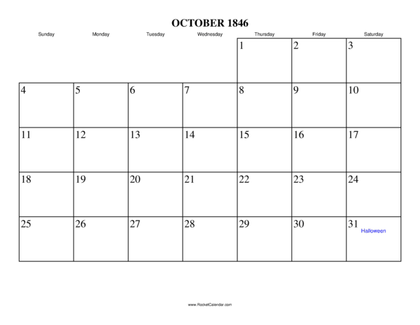 Next month: November 1846 | Previous month: September 1846 | All 1846 Calendars | Calendars for other years