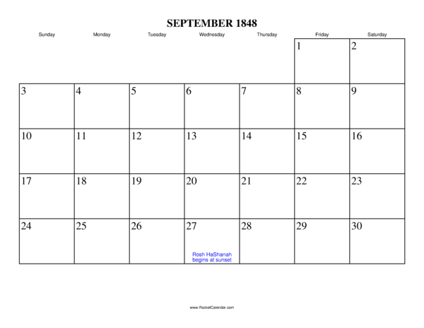 Next month: October 1848 | Previous month: August 1848 | All 1848 Calendars | Calendars for other years