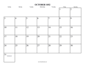 Next month: November 1852 | Previous month: September 1852 | All 1852 Calendars | Calendars for other years
