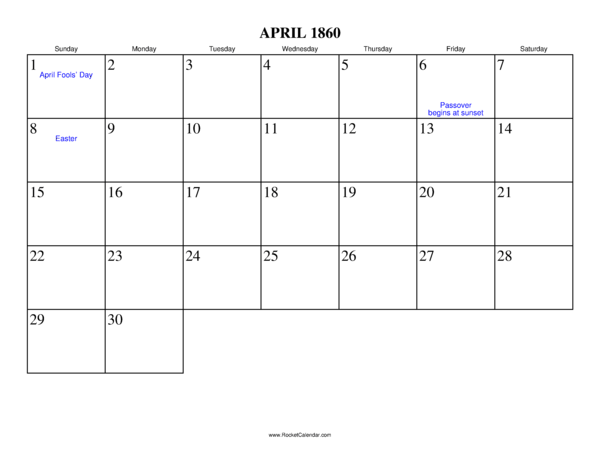 Next month: May 1860 | Previous month: March 1860 | All 1860 Calendars | Calendars for other years