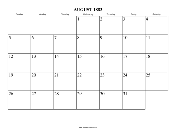 Next month: September 1883 | Previous month: July 1883 | All 1883 Calendars | Calendars for other years