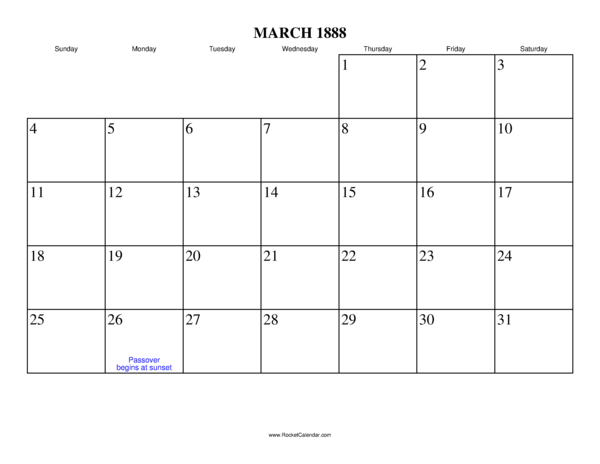 Next month: April 1888 | Previous month: February 1888 | All 1888 Calendars | Calendars for other years