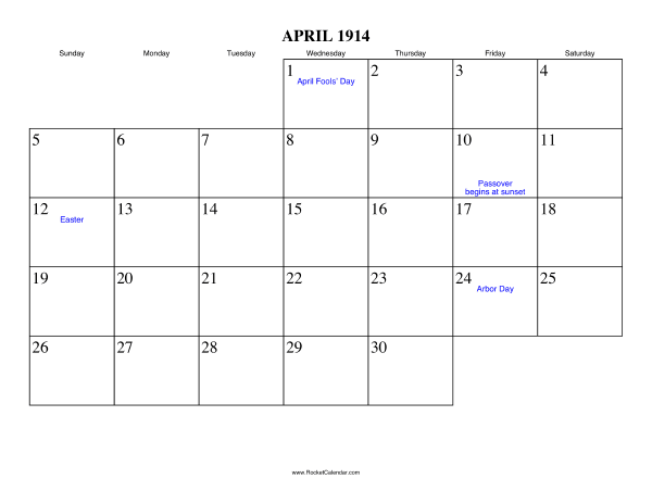 Next month: May 1914 | Previous month: March 1914 | All 1914 Calendars | Calendars for other years