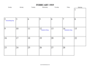 Next month: March 1919 | Previous month: January 1919 | All 1919 Calendars | Calendars for other years