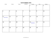 Next month: December 1951 | Previous month: October 1951 | All 1951 Calendars | Calendars for other years