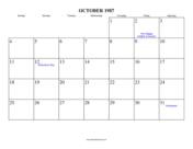 Free printable calendar for October 1987. View online or print in PDF format.