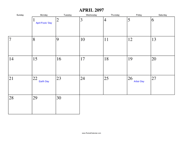 Next month: May 2097 | Previous month: March 2097 | All 2097 Calendars | Calendars for other years