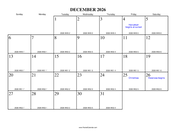 Previous month: November 2026 | All 2026 ISO Calendars | Calendars for other years